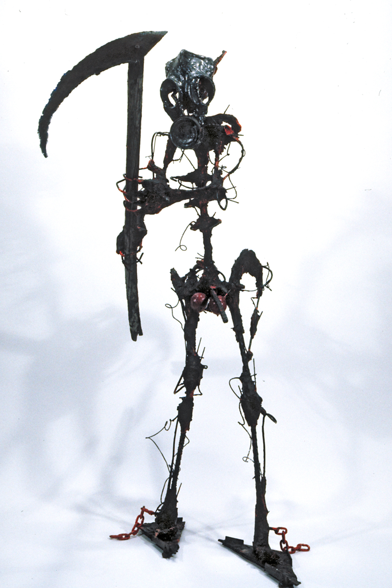 (with Gas Mask & Scythe), 1990, 49″h X 18″w X 43″d, 04 terra cotta, steel, oil, & mixed media
