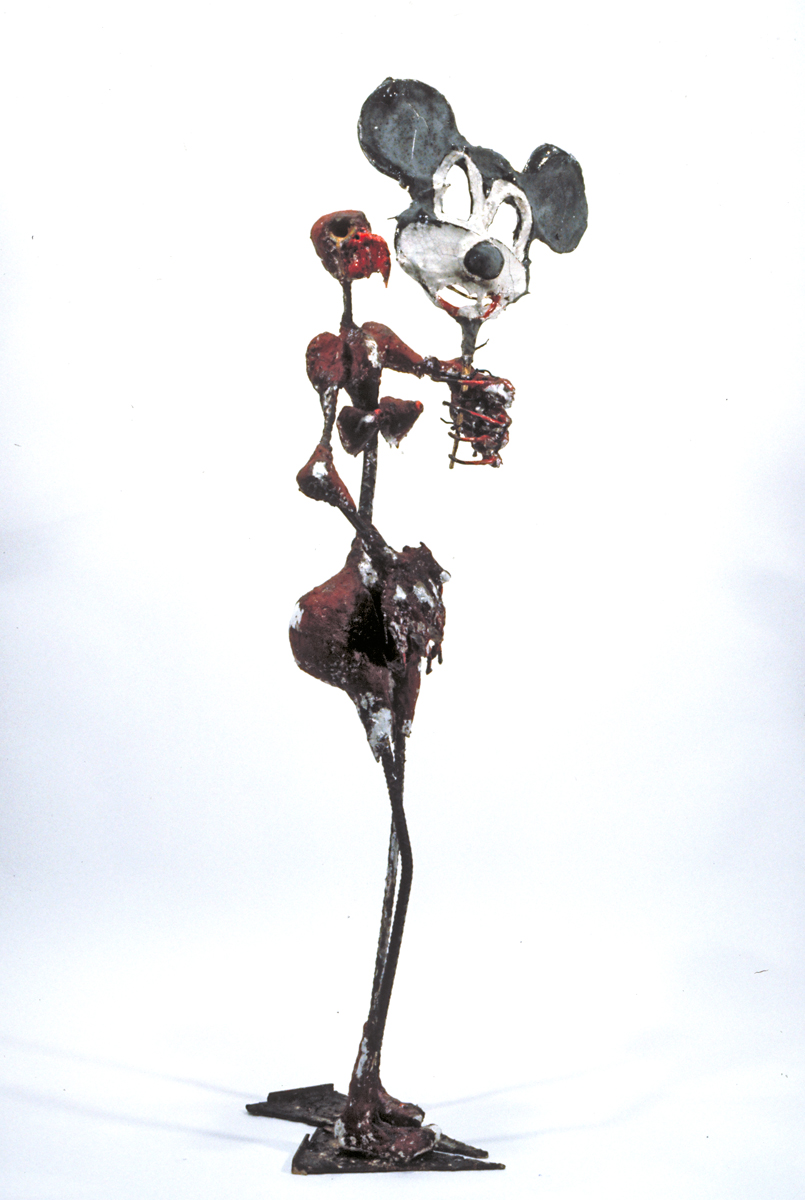 (with Mickey Mask), 1990, 49″h X 16″w X 13″d, 04 terra cotta, steel, oil, & mixed media